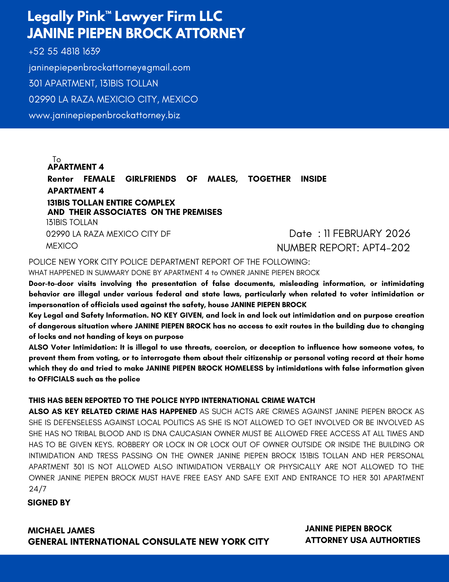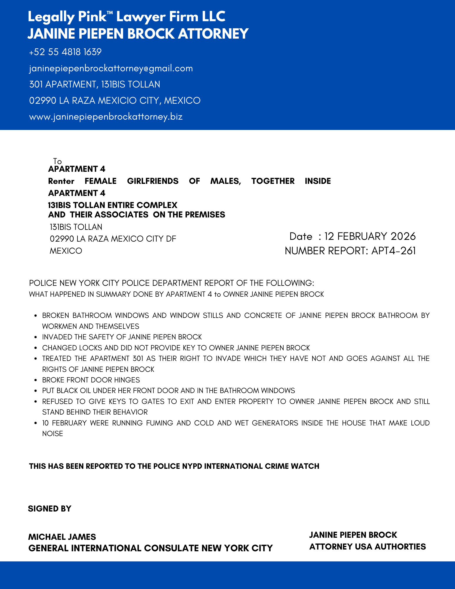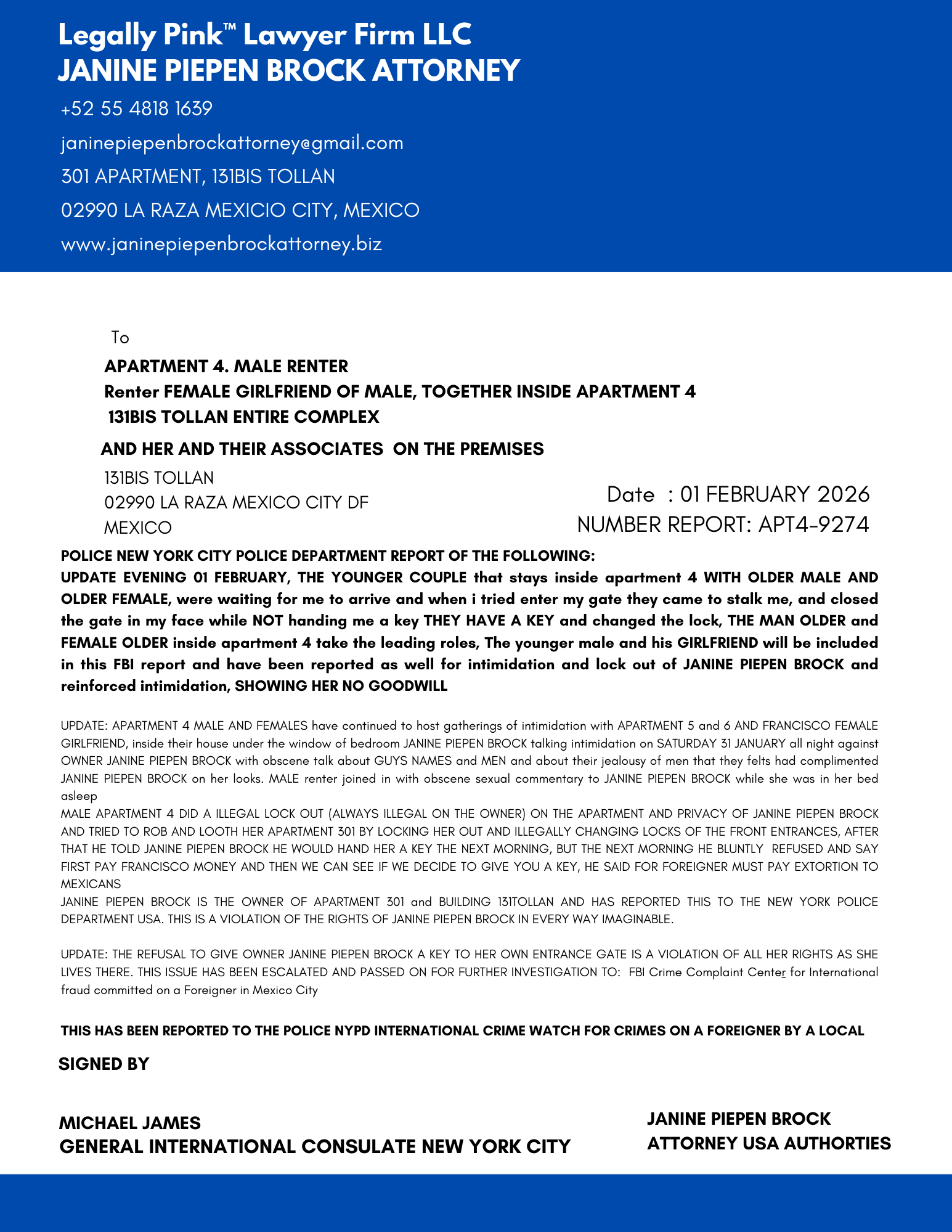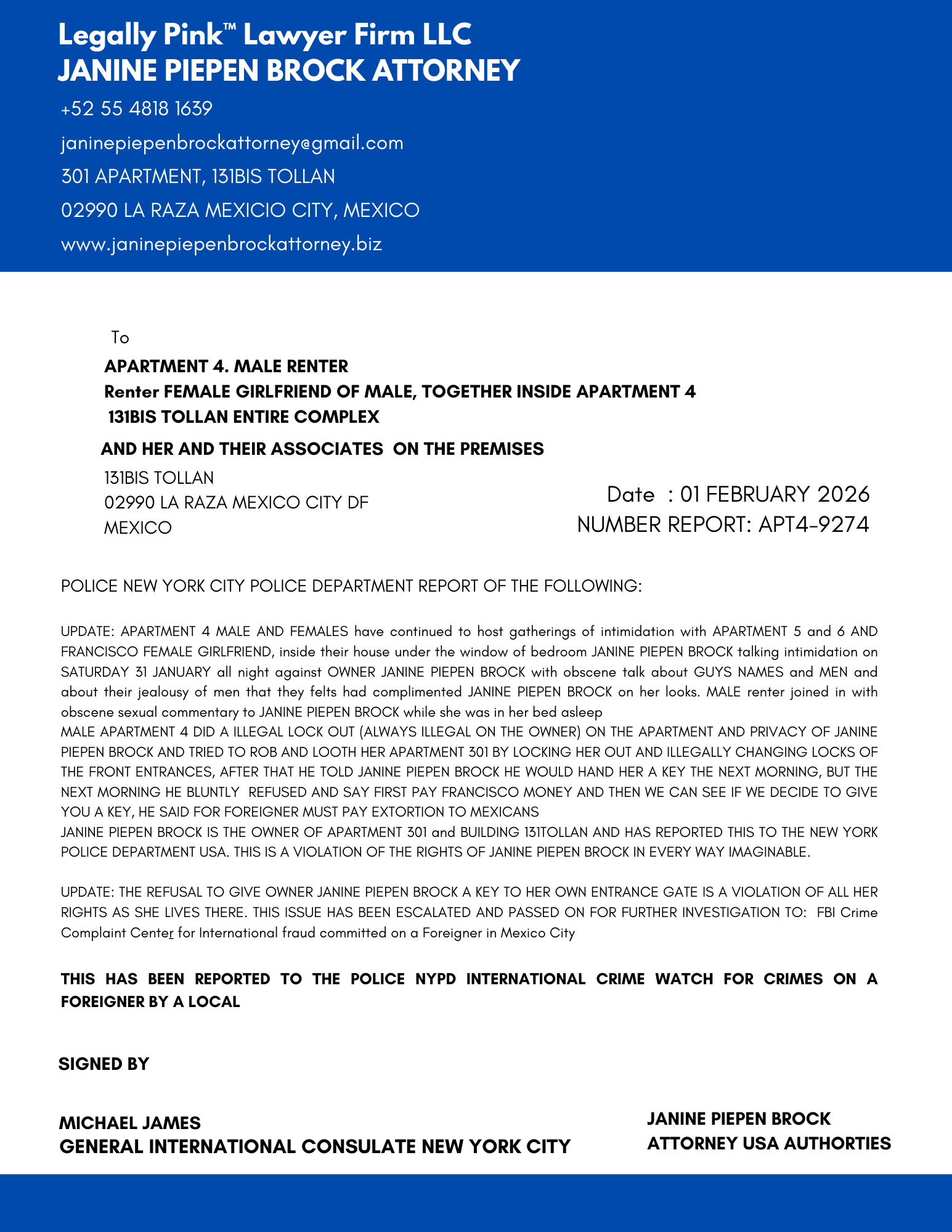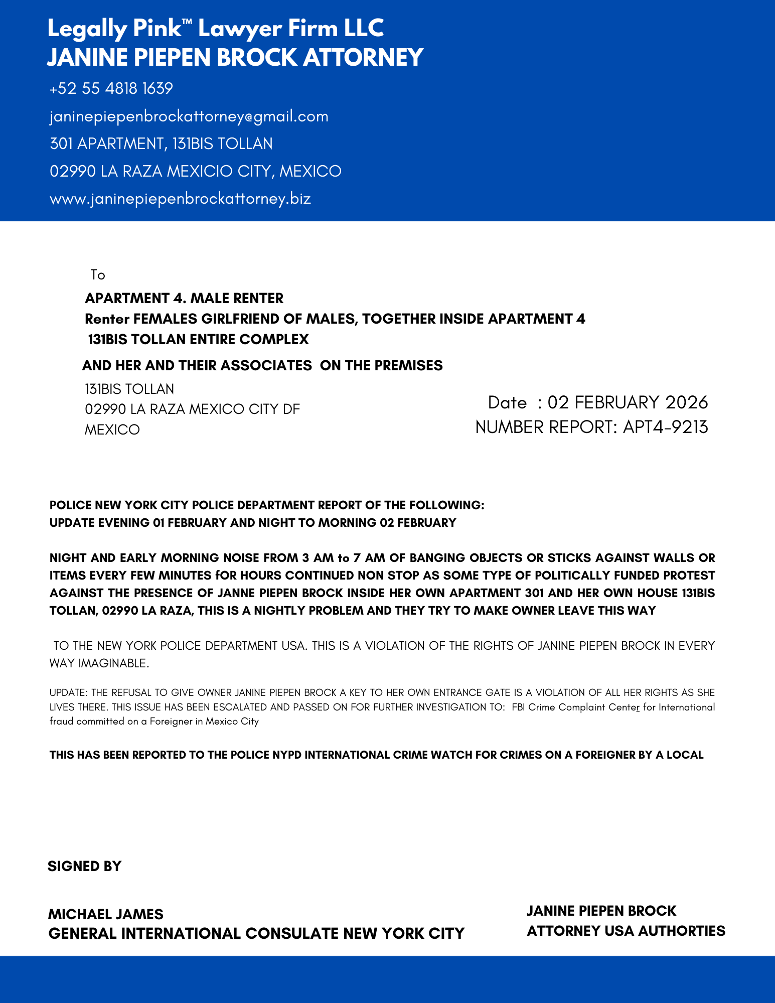 REPORT APARTMENT 4, FEMALE RENTER 11 JANUARY 2026
